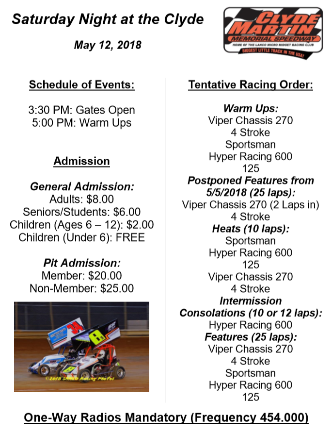 Next week, May 19, 2018, we will have Kid's Night which includes special activity for our little race fans, a quarter midget exhibition, postponed consolation and feature events from May 5, 2018 for the Hyper Racing 600 and Sportsman classes and a complete regular show for our five weekly classes.