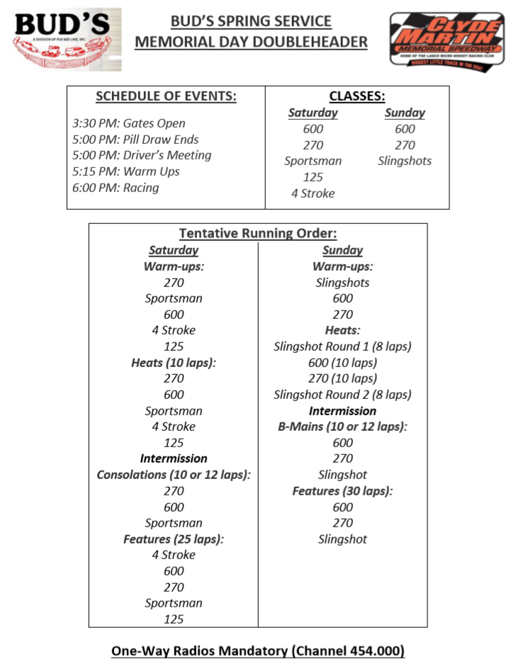 The second day of the Memorial Day Open will feature the 600, 270 and Slingshot classes. The 600 and 270 classes will be winged for both nights of the Memorial Day Open. The 600 and 270 drivers will receive payout for all finishing positions in all race events (Heats, B-Mains and A-Main). For more information on Day 2 please see the upcoming event page for that event.