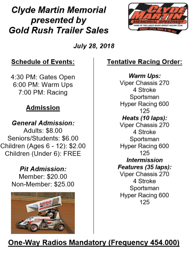 The biggest point paying event of the season is the annual Clyde Martin Memorial presented by Gold Rush Trailer Sales. Huge 35 lap feature events for all of our classes and drivers receiving double points will make this a can’t miss race.
