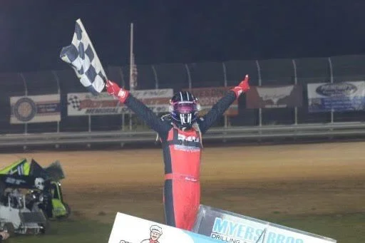 Brent Shearer stood in jubilation after scoring the victory in the Pistol Pete Duel A-Main at the Clyde Martin Memorial Speedway. (Photo Courtesy of Mike Knappenberger Photos)